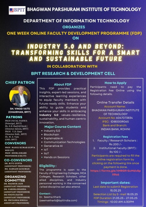 The department also promotes the interdisciplinary research activities among the students and faculty which is evident from the number of quality research papers published by the students and faculty members of IT department. The placement in terms of percentage and average package offered to the students is excellent. The interaction with industry and other academic institution of repute is another strong point of the department. I welcome you. Please feel free to contact in case you have any query related to department of Information Technology at hodit@bpitindia.com.